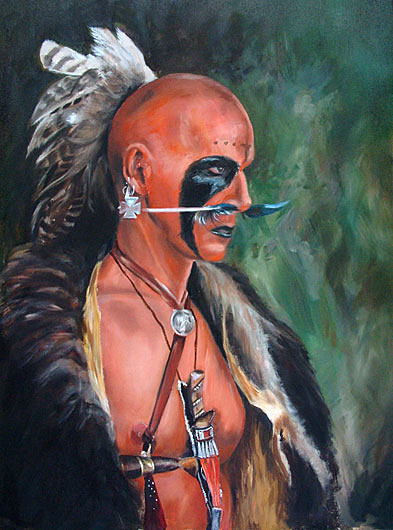 oil painting of an American Indian living history re-enactor. The image was painted from a photograph taken at Old Fort Niagara during a reenactment of the French and Indian War. This painting was a Second Prize Winner at the Erie County Fair and Exposition in Hamburg, New York. Please contact the