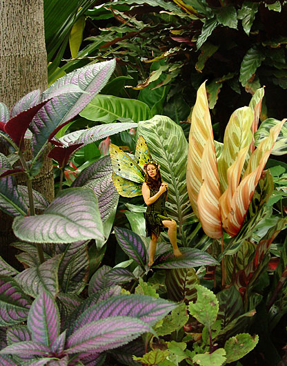 original fairy photograph. A fairy walks along a leaf among the flora at the Buffalo Botannical Gardens. This photograph won an Award of Special Achievement at the Erie County Fair and Exposition. Please