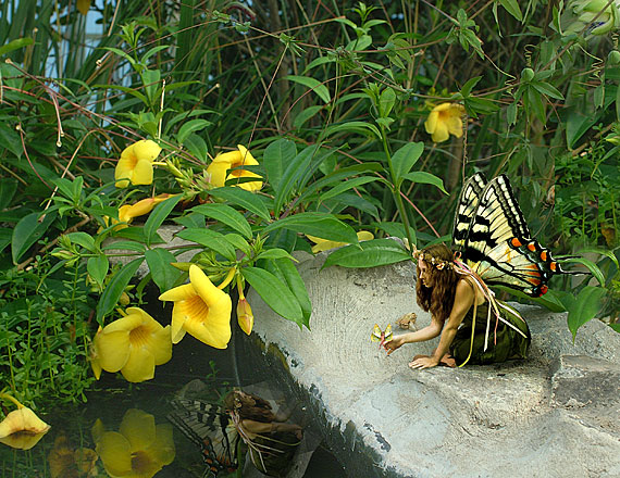 original fairy photograph. A fairy ponders her reflection among the flowers at the Buffalo Botannical Gardens. Please
