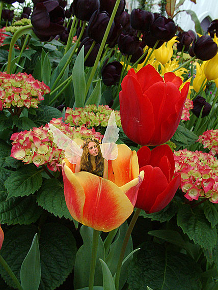original fairy photograph. A fairy rests inside a tulip among the flowers at the Buffalo Botannical Gardens. Please